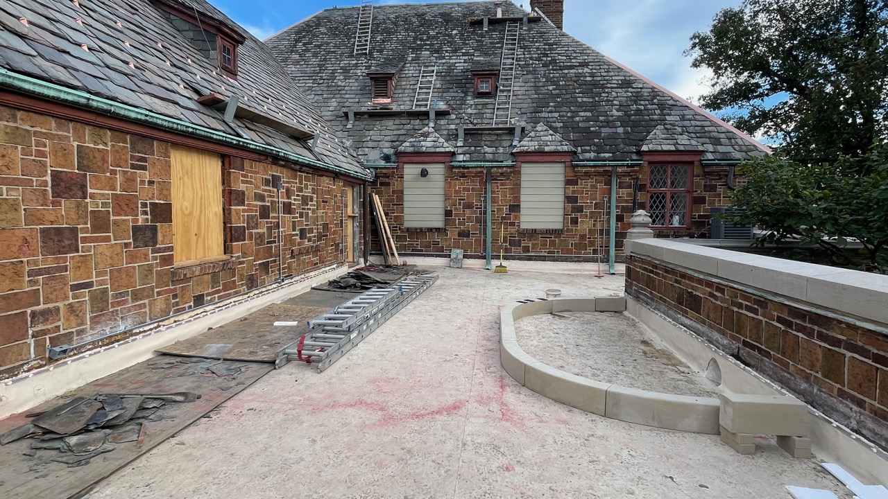 Roofing work on the slate, including new heavy duty copper ridge and hip flashing and snow guards, continues. Planting beds on West Studio Terrace taking shape. Early Oct. 2025.