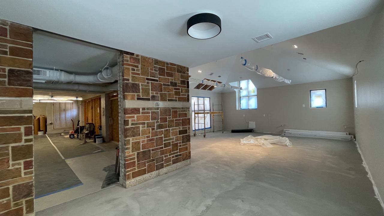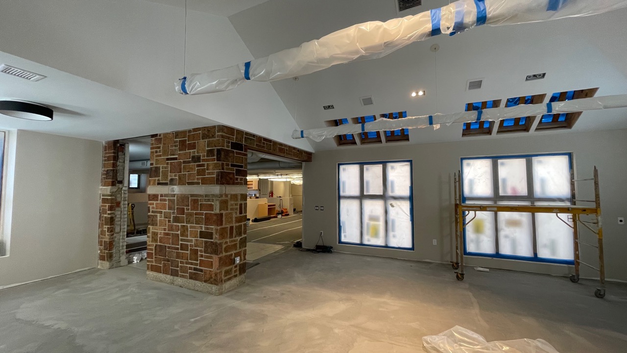 The intaglio print studio addition partitions have been removed. Lights in place. A view from the print study space. Early Oct. 2025.
